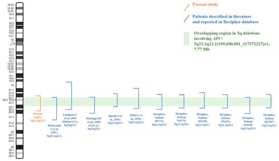 - Ofner, L.; Raedle, J.; Windpassinger, C.; Schwarzbraun, T.; Kroisel, P.M.; Wagner, K.; Petek, E. Phenotypic and molecular characterisation of a de novo 5q deletion that includes the APC gene. J. Hum. Genet. 2006, 51, 141–146. [Google Scholar] [CrossRef] [PubMed]