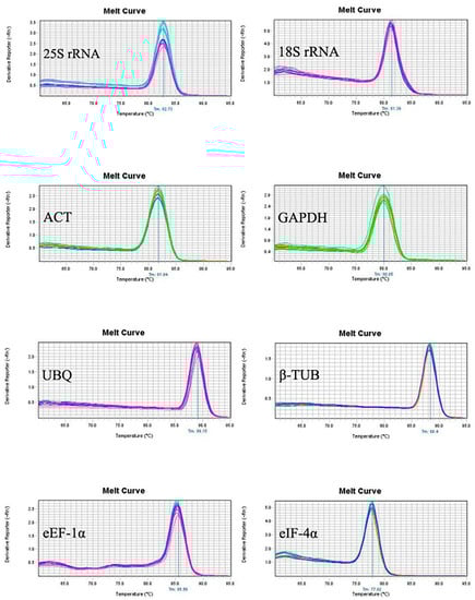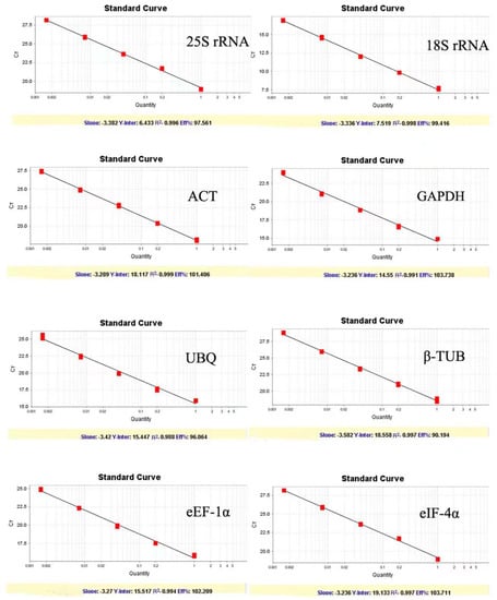 The sequencing results showed that the sequence of eight candidate reference genes obtained by cloning was consistent with those of the transcripts, suggesting the primers designed by the transcriptome data were reliable. The melting curves of the PCR amplification products were analyzed to verify the rationality of each pair of primers for the eight candidate reference genes (Figure 1). Melting curves showed a sole peak for each primer set indicating no non-specific amplification and the primer dimer. Amplification efficiency (E) among the test primers ranged from 90.19 to 103.73% with the correlation coefficient (R2) between 0.995 to 0.999 (Table 2 and Figure 2).