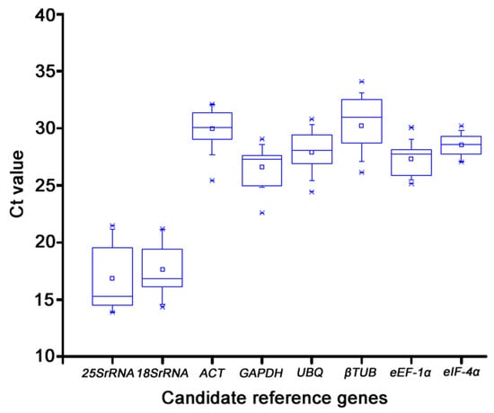 Cycle threshold (Ct) values of the calculated reference genes of all samples used in the experiments. Raw Ct values of fourteen samples were shown by a box plot. The box plot graph of the Ct value shows the mean values as a line across the box. Short-term represented the maximum and minimum values. Lower and upper boxes indicated the 25th percentile to the 75th percentile.