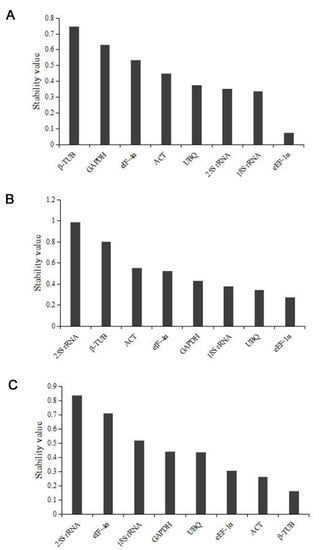 The results of the BestKeeper analysis were shown in Table 3. The results showed that the SD values of ACT, GAPDH, and β-TUB > 1 with low stability were unsuitable as reference genes at the reproductive phase. The correlation coefficient r value of 25S rRNA and 18S rRNA was relatively larger with a small SD value and CV, indicating that these two genes were suitable for synergistic use as reference genes. Comprehensive analysis showed that 25S rRNA and 18S rRNA were suitable for use as reference genes during the reproductive phases. At the nutritional phases, eEF-1α has a large correlation coefficient R and a minimum SD value and CV, indicating that gene expression stability between samples was strong and recommending that eEF-1α was suitable for the reference gene. In the end, eIF-4α has a minimum correlation coefficient r (−0.11) and a minimum SD value (0.44) and CV (1.57), suggesting that the expression of eIF-4α was stable between samples and suitable for reference alone at the three developmental stages of the leaf.