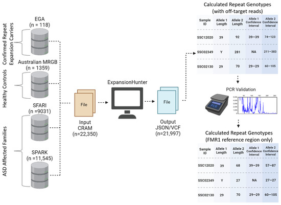 Workflow of calculating the FMR1 repeat length of 22,350 samples using ExpansionHunter: 22,350 sequence alignment files (CRAM format) were downloaded from either the (1) European Genome Archive (EGA), (2) Australian Medical Reference Genome Bank (MRGB), (3) Simons Foundation Autism Research Initiative (SFARI), or (4) the Simons Foundation Powering Autism Research (SPARK) initiative. ExpansionHunter was able to calculate repeat length genotypes for 21,977 samples (98.4%). Four SFARI families with at least one member predicted to carry an expanded repeat were used for molecular validation by PCR. PCR showed overestimation in the repeat lengths calculated by ExpansionHunter, which was shown to be caused by the use of off-target reads in repeat length calculation. To reduce overestimating expanded repeat lengths, samples originally identified to have repeats exceeding the normal range were calculated using only the FMR1 reference region.