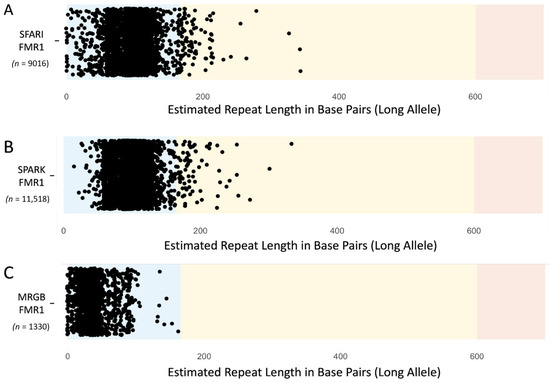 Estimated repeat length of the FMR1 trinucleotide repeat in SFARI. For each subject the longer allele for the FMR1 genotype is displayed in (A) SFARI, (B) SPARK, and (C) Australia MRGB. Alleles have repeat lengths within the normal (blue), premutation (yellow), or full mutation (red) range. Repeat length estimates were observed to fall within distributions within the normal range (30 bp–120 bp) or around the start of the premutation range.