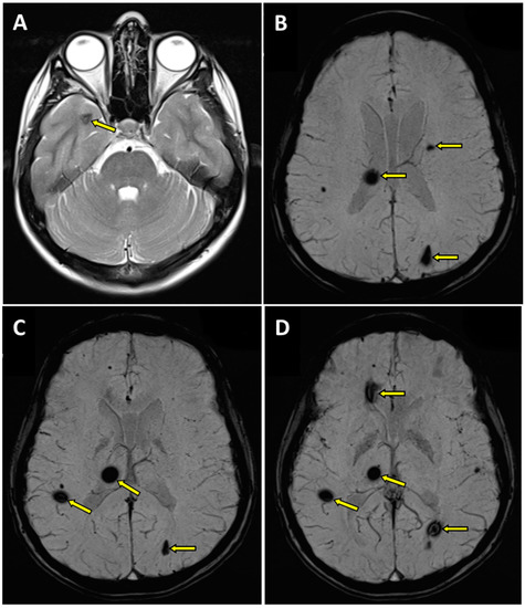 Magnetic resonance imaging (MRI) of the brain in T2 (A) and SWI (B–D) sequences. Transverse projection MRI showed the presence of cavernous hemangiomas within the right thalamus with hemosiderin deposits (B–D), at the fronto-parietal junction on the right side (C,D), in the semioval center on the left side (B), in the left occipital lobe (B–D), in the right temporal lobe (A), and in the right frontal lobe (D); pathologic changes marked with an arrow.