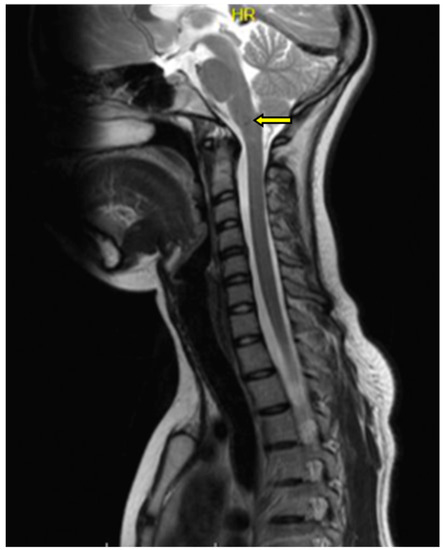 Magnetic resonance imaging (MRI) examination of the cervical spine in the T2 sequence. In the cervical spinal cord, no pathologies were seen. Within the medulla oblongata, a 2 mm lesion with a heterogeneous signal was visualized; pathologic change was marked with an arrow.