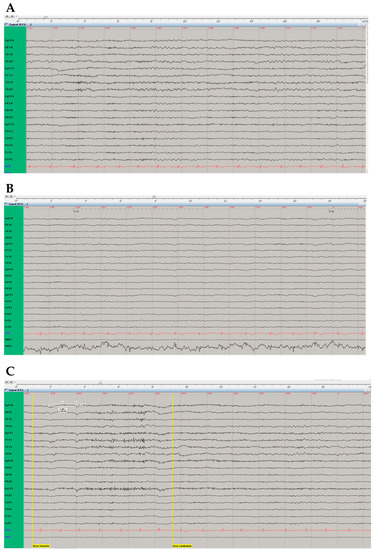 Electroencephalographic (EEG) examination. (A) “Double banana assembly”. EEG records without registration of paroxysmal changes, with registration of theta waves in the temporal and frontal-temporal leads, without clear lateralisation. (B) In photic stimulation during EEG record the background rhythm becomes time locked, representing a normal response. (C) Eyes-closed (“Oczy otwarte” [in Polish], left vertical yellow line) and eyes-open (“Oczy zamknięte” [in Polish], right vertical yellow line) reaction in EEG examination was normal.