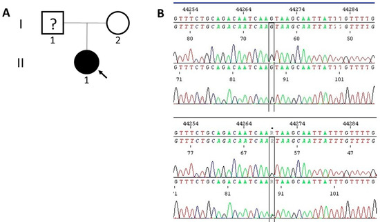 (A) The pedigree of the proband. The proband (II-1) is indicated with an arrow and marked with black as an affected individual. (B) The Sanger sequencing electropherograms of the proband (bottom) and her mother (upper).