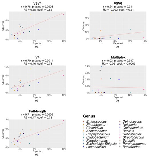 Correlation between the expected and observed 16S rRNA relative abundances (%) at the genus level for each sequencing approach. Correlation for (a) the V3V4 region; (b) the V5V6 region; (c) the V4 region; (d) the multiplex approach; (e) the full-length approach. For each method, the adjusted R2, linear model coefficient (coef.), Pearson correlation coefficient (r), and p-value are shown.