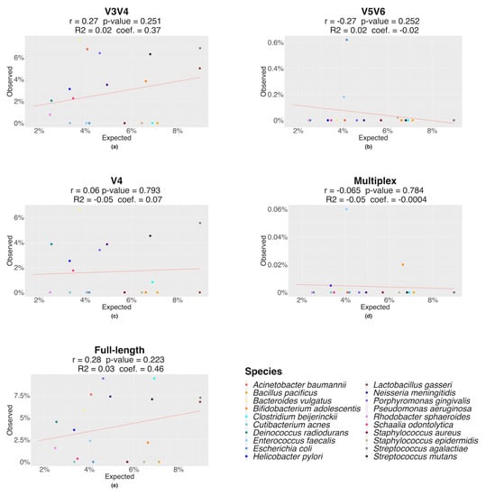 Correlation between the expected and observed 16S rRNA relative abundances (%) at the species level for each sequencing approach. (a) Correlation for the V3V4 region; (b) correlation for the V5V6 region; (c) correlation for the V4 region; (d) correlation for the multiplex approach; (e) correlation for the full-length approach. For each method, the adjusted R2, linear model coefficient (coef.), Pearson correlation coefficient (r), and p-value are shown.