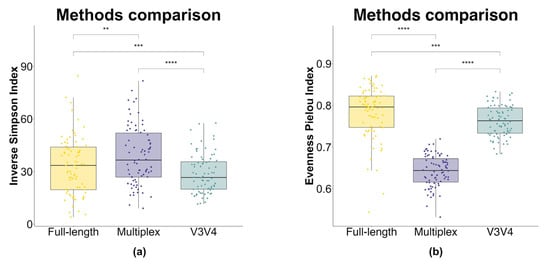 The α (i.e., intra-sample) diversity was investigated by using the inverse Simpson and Pielou’s evenness indices, starting from normalized ASV counts. Statistically relevant differences (p-value < 0.05) in both metrics were observed by using the paired t-test between the sequencing method sets (Figure 4). Overall, the multiplex method was characterized by the highest diversity according to the inverse Simpson index (Figure 4a), whereas Pielou’s evenness index resulted in the highest in the full-length method (Figure 4b), with all comparisons resulting in being statistically significant. In both the metrics, the diversity values obtained via the V3V4 approach were contained in the range of values of the full-length approach (Figure 4a,b).