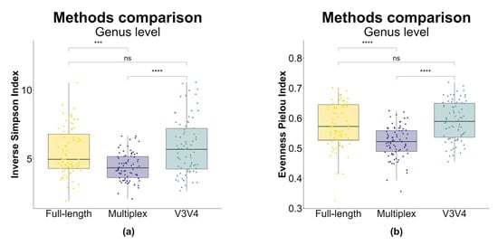 As explained by the rarefaction curves (Figure 3), both the full-length and the V3V4 approach can reliably estimate all the community diversity, instead of the unreached plateau for the multiplex data. These data are confirmed by Pielou’s index calculation which shows a greater evenness of the community for the full-length approach, which is therefore able to capture a higher biodiversity []. At the same time, the higher value of the inverse Simpson index recorded for the multiplex approach seems to not be associated with a real greater biodiversity but probably with the overestimation of ASVs (https://github.com/swiftbiosciences/16S-SNAPP-py3, accessed on 1 January 2020), as demonstrated by the related low Pielou’s index inference (Figure 4). This discrepancy is additionally confirmed by the α diversity analysis performed with both indexes at the genus level (Figure 5), highlighting the lower biodiversity captured by the multiplex method compared to the other methods.