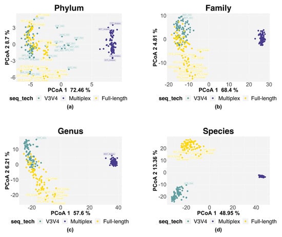 The β (i.e., inter-sample) diversity was measured by transforming the data through CLR (centered log ratio) and measuring inter-sample distances by applying the Aitchison distance to the unified taxonomic counts. The PCoA plot for the phylum-level data (Figure 6a) shows a clear separation between the multiplex data and V3V4/full-length data along the first component (PCoA1, 72.46%). The same trend of separation was observed for the family- and genus-level data too (Figure 6b,c) (PCoA1 68.4% and PCoA1 57.6%, respectively). On the contrary, from the phylum- to genus-level data (Figure 6a,c), the second component does not provide a sufficient variability for the separation between the three methods (PCoA2, 8.7%; PCoA2, 4.81%; PCoA2, 6.21%, respectively). Overall, the V3V4 and full-length data cluster together along the first component. Interestingly, at the species level (Figure 6d), the three methods separated well along both components (PCoA1 48.95% and PCoA2 13.36%). We used Permanova analysis with the Aitchison distance to compare the variability of the three methods. At the species level, the methodological approach of MPX differed greatly from V3V4 and FL, explaining 71.35% and 59.64% of the variation, respectively. In contrast, V3V4 and FL only differed by 27.65% (Table 5).