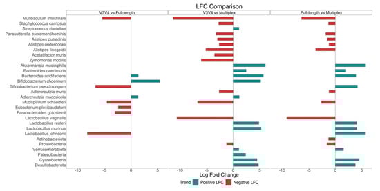 Bacteroidota, Firmicutes, Verrucomicrobiota, Actinobacteriota, and Proteobacteria were the principal phyla identified by the three methods. Bacteroidota (50.0% ± 9.84% in V3V4, 26.0% ± 6.13% in MPX, 41.1% ± 8.20% in FL) and Firmicutes (40.4% ± 11.59% in V3V4, 45.2% ± 11.12% in MPX, 47.1% ± 11.90% in FL) were assigned as dominant phyla, followed by the others. However, the microbiome composition determined by each sequencing method was statistically different at lower taxonomic levels. In particular, the microbiome characterized by the V3V4 and full-length methods was mostly represented by the genera Muribaculaceae (p. Bacteroidota; f. Muribaculaceae); Prevotellaceae_UCG-001 (p. Bacteroidota; f. Prevotellaceae); Lactobacillus (p. Firmicutes; f. Lactobacillaceae) with equally distributed species L. murinus and L. reuteri; Lachnospiraceae_UCG-001; Lachnospiraceae_NK4A136_group; Lachnoclostridium (p. Firmicutes, f. Lachnospiraceae); Ruminoccocus (p. Firmicutes; f. Ruminococcaceae); Parasutterella (p. Proteobacteria; f. Sutterellaceae), and Akkermasia (p. Verrucomicrobiota; f. Akkermansiaceae) with the species A. muciniphila. All these taxa resulted in being statistically more abundant in the two methods mentioned above than in the multiplex method (lfc > |1|, p-value < 0.05). Moreover, only the genus Faecalibaculum (p. Firmicutes; f. Erysipelotrichaceae) was statistically more abundant in the full-length data, whereas the species L. johnsonii (g. Lactobacillus) and B. pseudolongum (g. Bifidobacterium) were exclusively identified by the full-length. In contrast, the multiplex method characterized a microbiome statistically composed of the genera Muribaculum (p. Bacteroidota; f. Muribaculaceae) with the species M. intestinale, Alistipes (p. Bacteroidota; f. Rikenellaceae), Bacteroides (p. Bacteroidota, f. Bacteroidaceae), Tepidibacter (p. Firmicutes; f. Peptostreptococcaceae), Bacillus (p. Firmicutes; f. Bacillaceae) with an incorrectly classified species L. vaginalis, Bifidobacterium (p. Actinobacteriota; f. Bifidobacteriaceae), Amphiplicatus (p. Proteobacteria; f. Parvularculaceae), and Pigmentiphaga (p. Proteobacteria; f. Alcaligenaceae). Unusually, the only species of the genera Bacteroides and Bifidobacterium with RA > 1% were B. acidifaciens, B. choerinum, and B. pseudolongum; these were not identified by the multiplex method, but by the other methods. Finally, from the phylum to family levels, no unclassified ASVs were observed for the full-length method. Finally, the full-length method did not have any unclassified ASVs from the phylum to family levels. However, the rate of unclassified ASVs increased slightly at the genus level, but it was still the lowest among the methods. On the other hand, the multiplex method had the highest rate of unclassified ASVs already at the phylum level.
