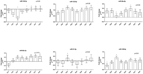 Sixteen miRNAs were successfully measured, namely: miR-126-3p; miR-155-5p; miR-122-5p; miR-125a-5p; miR-146a-5p; miR-181a-5p; miR-17-5p; miR-144-5p; miR-26a-5p; miR-29c-3p; miR-143-5p; miR-92a-3p; miR-27a-3p; miR-365a-3p; miR-185-5p; and miR-21-5p. As we reported previously [18], there exists a correlation between the quantity of miRNAs in plasma and ST. After ST adjustment, we found changes in the quantity of miR-92a (p < 0.0001), miR-185 (p < 0.01), miR-21 (p < 0.02), miR-126 and miR-122 (all p < 0.03), and miR-26a (p < 0.04) at the FU time points. Most miRNAs oscillated during FU; only miR-92a showed an increasing trend (Figure 1).