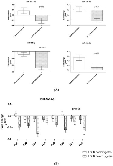 In LDLR mutation homozygotes (N = 5; 42% of patients), we detected higher plasma levels of miR-155 (p < 0.0006), miR-126 (p < 0.01) and miR-181 and miR-92a (both p < 0.03) compared to LDLR heterozygotes (N = 7; 58%) (Figure 2A). Moreover, we identified significant differences in miR-155 quantity between LDLR homo vs. heterozygous patients during FU (p < 0.05) (Figure 2B).