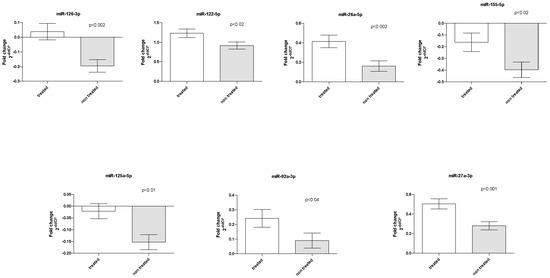 Six patients (4 LDLR homozygotes/2 LDLR heterozygotes) were under combined LA treatment with PCSK9 inhibitors. Two patients were treated with PCSK9 inhibitors throughout the FU. Three patients started treatment with PCSK9 inhibitors during the FU, and one patient had interrupted treatment at 2 FU points. Treatment with PCSK9 inhibitors affected the plasma levels of seven miRNAs. Briefly, increased quantities of miR-126, miR-27a, miR-26a (p < 0.002), miR-122 and miR-155 (p < 0.02) and miR-92a (p < 0.04) were determined in patients treated with PCSK9 inhibitors (Figure 3).