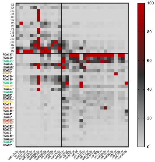 Heat map representing the expression of the 32 miRNAs found to be dysregulated in PDAC vs. CTRL tissues with p < 0.05 and 0.5 ≥ FC ≥ 2. Red indicates upregulation, light gray indicates downregulation, and dark gray indicates unmodified miRNA expression. After transforming the 2−ΔCt values, the miRNAs were scaled in a manner that considered the lowest value as 0% and the highest value as 100% and ordered according to their expression levels. The columns refers to the miRNA symbols, and the rows refer to individual tissue samples. The color of the patient code reported in the rows indicates anatomic location (black = head; green = neck, body = red, body–tail = orange, and tail = yellow). The underlined codes refer to patients reporting hepatic metastasis, and * indicates the patients with lymph node involvement.