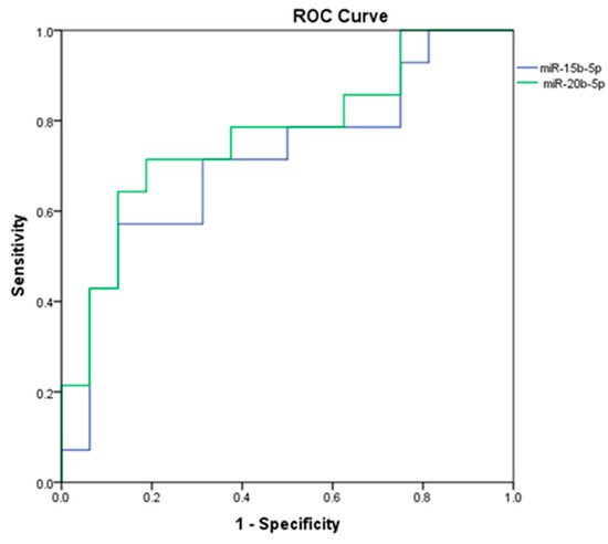 ROC curves for the two potential miRNA biomarkers (miR-15b-5p and miR-20b-5p) that seem to be able to discriminate between patients with/without hepatic metastasis.