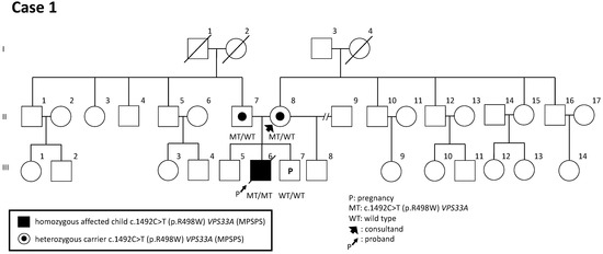 Family tree of case 1. The pedigree of case 1 presents the situation after confirmation of variant c.1492C>T (p.R498W) in VPS33A in proband (III-6). The next fetus (III-7) was not affected by the variant in VPS33A.