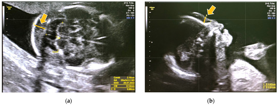 Prenatal ultrasonography of case 2 in the second trimester. (a) Nuchal fold thickness is the area of tissue at the back of the fetus (indicated by an arrow). (b) Prenasal thickness is the shortest distance between the anterior edge of the lowest part of the frontal bone and the facial skin anteriorly (indicated by an arrow). Both of them were increased.