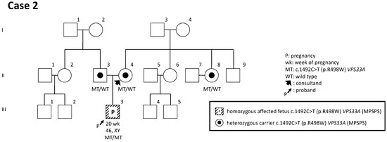 The family history was not burdened at that time (in 2016). Due to the US features and moderate risk for Trisomy 21, the woman underwent invasive prenatal diagnosis (IPD) via placenta biopsy to determine the karyotypic status of the fetus. The resulting karyotype was normal and showed 46,XY [11/11]. The baby was delivered at the 39th week of pregnancy. Starting from 2 months of age, the boy suffered from bronchitis. At the age of 11 months, MPSPS was suspected due to clinical manifestations such as stiffness of joints in the hands, distinctive facial features and hepatosplenomegaly. GT, which was available in 2017, confirmed a homozygous variant of c.1492C>T (p.R498W) in the VPS33A gene in the boy (III-6); then, a heterozygous variant was identified in both parents (II-7, II-8) (Figure 1). The boy died at the age of 18 months.