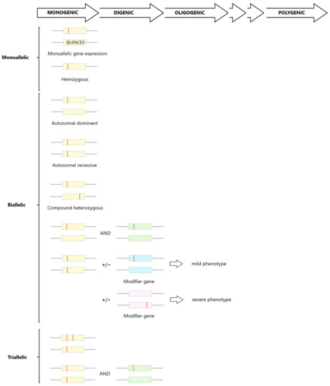The concept of genetic modifiers was first introduced in 1941 by Haldane, but multiple definitions have since been suggested [34]. Herein, modifier genes are defined as genes that alter the disease phenotype but are not required for the primary disease to be present. This is distinct from digenic or oligogenic inheritance, whereby two or more genes are essential for the manifestation of the primary disease phenotype [35]. Genetic modifiers can affect the expression of another gene at multiple different organisational levels, including transcription, protein interactions, or the cellular and organ level [36]. Terms such as epistasis, digenic/oligogenic inheritance, or modifier genes are often used interchangeably to describe the effect of one gene/allele on the phenotypic outcome of another gene/allele [35]. For tri-allelic inheritance (which can be synonymous with digenic or oligogenic inheritance), at least three mutated alleles are required to manifest a primary disease phenotype. Most typically, this involves both alleles of one gene and at least one allele in a second gene; however, all three variants can occur on the same gene (Figure 2) [37]. Modifiers can be additive or suppressive and can affect penetrance, expressivity, and dominance. This review collates the evidence for the role of modifier genes and oligogenic inheritance on the phenotypic spectrum of TKD and attempts to bridge the gap between apparently rare monogenic TKD and polygenic non-proteinuric CKD. Whilst epigenetic, environmental, and non-coding factors may also play a role, these are outside the scope of this review.