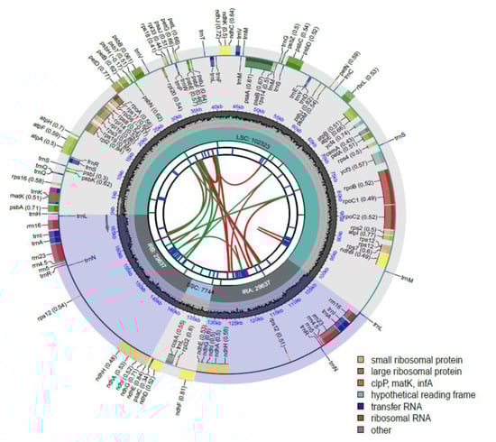 The plastid genome (plastome) is widely used for the genetic identification and phylogenetic analysis of plant species [7]. The plastome provides variable sites for genetic identification and evolution analyses because it has the advantages of no recombination, the presence of single-copy genes, and a low rate of nucleotide substitution [8]. Complete plastome sequencing is a possible solution for resolving taxonomic relationships in plant species [9]. Plant chloroplasts are the main sites of photosynthesis and play an important role in many cellular functions such as carbon fixation, energy conversion, and stress responses [10]. Chloroplast genomes have specific characteristics such as small size and frequent polymorphisms. They are haploid and exhibit uniparental inheritance [11]. Therefore, chloroplast genomes are widely used in studies of genome evolution, population structure, and molecular genetics [12,13]. The chloroplast genome sizes of higher plants range from 120 to 180 kb [14], and the genome sequences are highly conserved comprising 110–130 genes [15]. The chloroplast genome is highly stable in higher plants, and its circular structure is primarily conserved and divided into four major regions: large single-copy (LSC) and small single-copy (SSC) regions separated by two inverted repeats (IRs) of equal length [16]. However, differences in chloroplast genome sequences can be significant among the species and, therefore, have been useful in species circumscription [17].