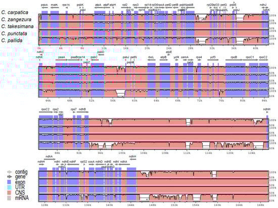 Multi-alignment analysis using the mVISTA program was performed to determine the level of divergence between C. carpatica and four other Campanula species: C. pallida (NC_063742), C. punctata (NC_033337), C. takesimana (NC_026203), and C. zangezura (NC_057269). DNA sequence divergence among the species is a function of neutral, deleterious, and advantageous mutation rates [37]. In the sequence divergence of five Campanula species, multi-alignment results indicated that the genome structure, gene order, and gene content have highly conserved sequences among the five Campanula species. A comparison of the LSC, IR, and SSC regions revealed that the LSC region contained more divergent genes (Figure 2).