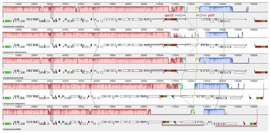 Collinear alignment between C. carpatica and the four other Campanula species using Mauve software. Locally collinear blocks (LCBs), the most conserved collinear regions of the genomes, are depicted as shaded colored boxes connected by a line, and the x-axes indicate the coordinate lengths in the located chloroplasts.