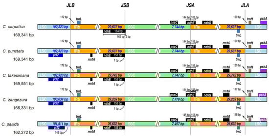 Comparison of boundaries between the LSC, SSC, and IR regions of chloroplast genomes of selected Campanula species. JLB, the junction between the LSC/IRb; JSB, the junction between the SSC/IRb; JSA, the junction between the SSC/IRa; and JLA, the junction between the LSC/IRa. Boxes above or below the main lines indicate genes near the described boundaries.