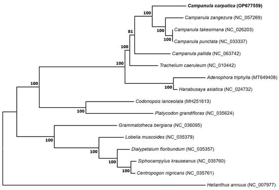 A phylogenetic tree constructed using 63 conserved protein-coding genes of 16 plant species, including the chloroplast genome of C. carpatica. The complete chloroplast sequence of the Asteraceae family (H. annuus) was used as an outgroup to root the tree. The bootstrap support values (>50%) from 1000 replicates are indicated on the nodes.