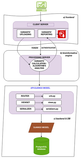 The general architecture of MAGI-ACMG web application. (a) The front-end section is built using Vue.Js. In this part, the user uploads the variants to be analyzed. The user can interact with the checklist to modify criteria and recalculate the final interpretation. The user can generate a PDF for each sample containing information on the analyzed variants. (b) Every query to the server has to pass an authentication mechanism. In this part, the bioinformatics engine performs the analysis for the uploaded variants and the MAGI-ACMG algorithm runs. (c) The back end is developed using Django REST Framework and PostgreSQL database. The data of the application is exposed as JSON via Django REST Framework application program interfaces (APIs). We have implemented serializers for converting data to execute requests and routing for API endpoints.