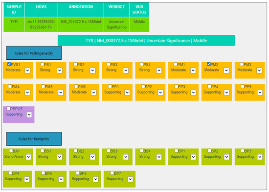 For the variant NM_000372.5:c.1586del, NP_000363.1:p.(Leu529Tyrfs*7) in the TYR gene, the PVS1 criterion has been assigned at a Moderate level using the AutoPVS1 tool according to the specific guidelines [2]. The PM2 criterion is always kept at a Moderate level (Table 3, Figure 3).