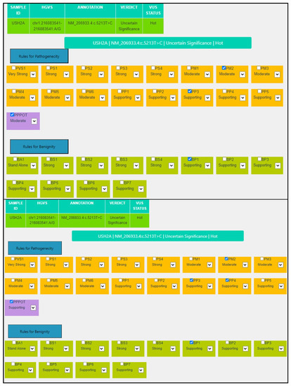 For the variant NM_206933.4:c.5213T>C, NP_996816.3:p.(Phe1738Ser) in the USH2A gene, PP3 is assigned because 14/15 predictors are damaging, Revel score: 0.767 (>0.644) and CADD score: 28.30 (>25.3). Moreover, this VUS was found in an individual clinically diagnosed with Usher syndrome (PP4) who also carried a pathogenic frameshift variant in the same gene (USH2A:NM_206933.4:c.2299del), but with unknown phase. Therefore, the pipeline automatically introduced the P_POT criterion at Supporting strength to highlight that segregation analysis might reveal in-trans configuration, thus allowing us to classify the variant as likely pathogenic (Table 4, Figure 4).