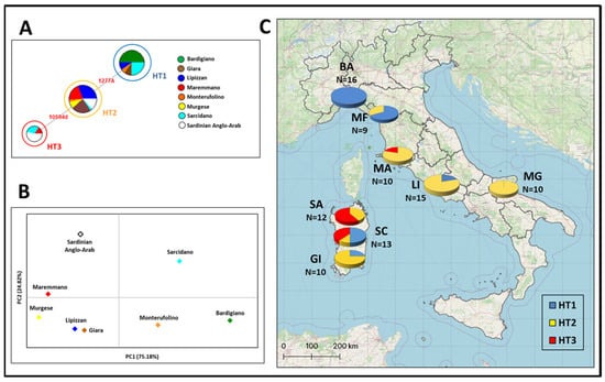 Median-joining Network based on the Y-chromosome haplotypes of eight Italian horse breeds (A), where circles are proportional to the observed frequency for each haplotype (HT1: N = 33; HT2: N = 48; HT3: N = 13); PCA plot representing the genetic landscape of Italian breeds based on their genetic distances (B); spatial MSY haplotype frequencies of 94 stallions considered here (C). Further details are reported in Table S1.