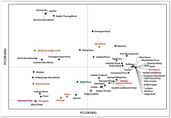 The plot points out the relatedness of Bardigiano and Monterufolino with breeds from Central and Northern Europe due to the high frequencies of HT1, while Murgese clustered substantially with breeds from Eastern Eurasia, thus confirming results obtained from the mtDNA for the female counterpart [].