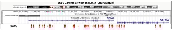 Genomic organization of the OCA2 and HERC2 genes. OCA2 and HERC2 are very close to each other on human chromosome 15, with the 3′-end of HERC2 adjacent to the promoter region of the OCA2 gene. The red box in the chromosome ideogram indicates the position of the OCA2-HERC2 locus. Image from the UCSC Genome Browser (http://genome.ucsc.edu, accessed on 2 June 2023). At the bottom, the positions of the SNPs related to eye color, with details described in this section, are indicated by red arrows.