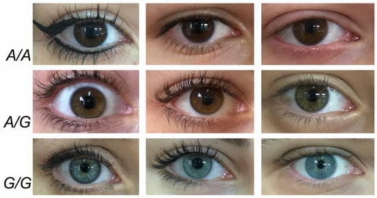 - Sturm, R.A.; Duffy, D.L.; Zhao, Z.Z.; Leite, F.P.; Stark, M.S.; Hayward, N.K.; Martin, N.G.; Montgomery, G.W. A Single SNP in an Evolutionary Conserved Region within Intron 86 of the HERC2 Gene Determines Human Blue-Brown Eye Color. Am. J. Hum. Genet. 2008, 82, 424–431. [Google Scholar] [CrossRef]