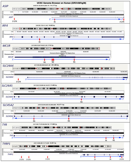- Sulem, P.; Gudbjartsson, D.F.; Stacey, S.N.; Helgason, A.; Rafnar, T.; Magnusson, K.P.; Manolescu, A.; Karason, A.; Palsson, A.; Thorleifsson, G.; et al. Genetic determinants of hair, eye and skin pigmentation in Europeans. Nat. Genet. 2007, 39, 1443–1452. [Google Scholar] [CrossRef]