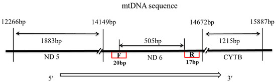 Mitochondrial DNA (mtDNA) is considered to be the best molecular genetic marker to study the origin, evolution, and classification of species because of its maternal inheritance, rich base polymorphisms, and simple structure [5]. mtDNA genes have been widely used as biomolecular diagnostic markers and molecular genetic markers in the field of livestock [6,7,8]. Among the NADH(nicotinamide adenine dinucleotide hydride) dehydrogenases, the NADH dehydrogenase subunit 6 (ND6) gene has a relatively short sequence length, a simple structure without introns, a moderate evolution rate, abundant sequence variations, and a significantly higher mutation rate than cell nuclear DNA and has been widely used in the population genetic structure analysis of domestic cattle [9], domestic fowl [10], and insects [11].