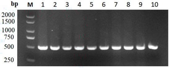 The partial electrophoresis results of PCR amplification for 2 mtDNA fragments (Olympus, Japan). Note: M: DL1500 marker; 1–10: PCR products of ND6.