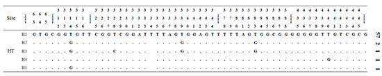 The distribution of the unique haplotype variable sites of the mtDNA ND6 gene in the five goose breeds is shown in Figure 4. Haplotypes 1 and 3 had the most variable sites, with four sites each. The variable sites of haplotypes 4 and 5 contained at least one variable. The number of geese with haplotype 1 was the largest and there were only one or two geese with the other haplotypes. As all insertions and deletions were removed from the analysis, the variable types were classified as transitions and transversions.