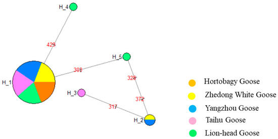 The distribution and frequency of unique mtDNA ND6 haplotypes in the five goose breeds are shown in Table 4. The Lion-Head geese had the largest number of unique haplotypes, with three haplotypes accounting for 27.27% of their frequency. The Zhedong White goose, Yangzhou goose, and Taihu goose each with two haplotypes accounted for 18.18% of the frequency and the Holdobagy goose accounted for 9.09%. Among them, haplotype 1 was shared by five breeds of geese and haplotype 2 was shared by Yangzhou geese and Zhedong White geese (Figure 5).