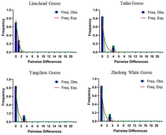 Analyses of population phylogenetic trees are increasingly used to infer the process of the historical evolution of populations. Population history evolution is usually detected using two methods: a population-based neutrality test such as Tajima’s D and Fu’s Fs analyses, or a base difference analysis. In the current study, the neutrality test (Tajima’s D) values of Taihu, Yangzhou, and Zhedong White geese were negative (D < 0) and the distribution of base difference mismatches showed a Poisson distribution [38], indicating that Taihu, Yangzhou, and Zhedong White geese may have experienced a certain degree of population expansion over a long period. However, Tajima’s D value and Fu’s Fs value of the Lion-Head goose neutral test were both negative and the difference was not significant (p > 0.10), indicating that the Lion-Head goose population was in line with the neutral mutation result and that the Lion-Head goose population was in a stable state. A unimodal curve pattern that did not fit the population expansion was consistent with the neutral detection results. This indicated that the population was not undergoing species expansion or continuous growth [39,40] and that large-scale migration may have occurred in the early stage. In future studies, artificial selection should be increased.