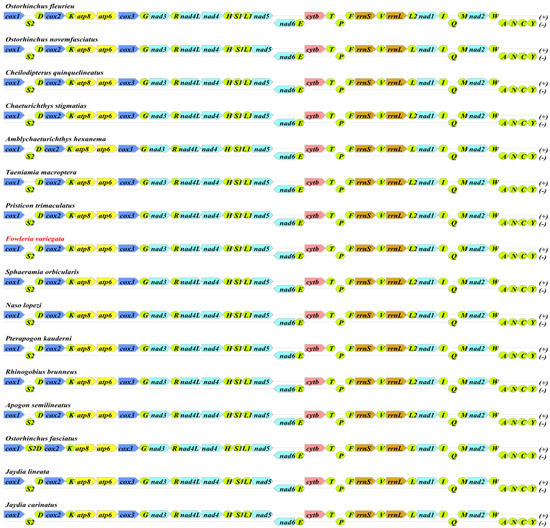 Wang, J.; He, W.; Huang, H.; Ou, D.; Wang, L.; Li, J.; Li, W.; Luo, S. A Comprehensive Analysis of the Fowleria variegata (Valenciennes, 1832) Mitochondrial Genome and Its Phylogenetic Implications within the Family Apogonidae. Genes 2023, 14, 1612. https://doi.org/10.3390/genes14081612