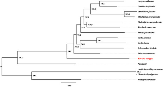 Wang J, He W, Huang H, Ou D, Wang L, Li J, Li W, Luo S. A Comprehensive Analysis of the Fowleria variegata (Valenciennes, 1832) Mitochondrial Genome and Its Phylogenetic Implications within the Family Apogonidae. Genes. 2023; 14(8):1612. https://doi.org/10.3390/genes14081612