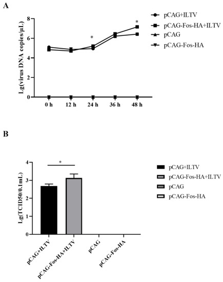 3.5. Overexpression of Fos Promotes the Replication of ILTV