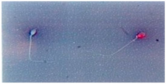 On a glass slide, 10 μL of ejaculate was mixed with 10 μL of 0.5% aqueous yellowish Eosin Y solution. The mixture was covered with a cover slide, then evaluated after 3–5 min by distinguishing between the dead spermatozoa (red stained) and live spermatozoa (not stained) (Figure 1). A total of 200 spermatozoa from each slide were evaluated per slide under a phase-contrast microscope.