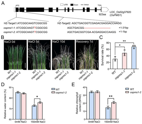 The knockout lines of OsPMS1, one with a 1 bp insertion and a 31 bp deletion (ospms1-1) and another with a 1 bp insertion and a 1 bp deletion (ospms1-2), both resulted in frameshift mutations in the OsPMS1 protein (Figure 2A). The T3 generation ospms1 mutant (ospms1-1 and ospms1-2) seedlings showed no significant difference in morphology compared with the wild-type seedlings at day 12. Subsequently, we treated these 12-day-old rice seedlings with 150 mM NaCl to observe their growth. On the 5th day of treatment, the wild-type seedlings exhibited obvious wilt symptoms on almost all leaves, while the ospms1 mutant seedlings had only a few withered leaves. On the 10th day of treatment, the leaves of the ospms1 mutant seedlings appeared less shrunk and curled than the wild-type plant; the stems of these mutants were greener and firmer, with higher fresh and dry weights than those of the wild-type seedlings (Table S2). Collectively, the ospms1 mutants showed better growth than the wild-type seedlings (Figure 2B). The survival rate of the two ospms1 mutant seedlings were significantly higher than that of the wild-type seedlings (Figure 2C). Then, we selected the ospms1-2 mutant, with a more pronounced and stable salt-tolerant phenotype, to assess the relative water content and the relative chlorophyll content. We found that the relative water content and the relative chlorophyll content of the ospms1-2 mutant seedlings were significantly higher than those of the wild-type seedlings (Figure 2D,E). These results indicated that ospms1 mutant seedlings had a better salt-tolerant phenotype than the wild-type seedlings at the seedling stage.