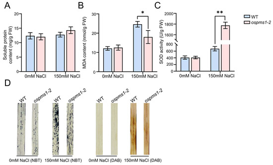 Oxidative stress in leaves of ospms1-2 mutant and WT seedlings at 0 and 3 days of salt stress. (A) soluble protein content. (B) MDA content. (C) SOD activity; Each column represents the mean ± SD (three replicates). Significant differences, which were determined by Students’ t test, are indicated by asterisks (* p < 0.05 and ** p < 0.01). (D) ROS detection in the leaves of WT and ospms1-2 mutants under normal and salt stress conditions. Leaves stained with NBT and DAB were used to assess O2− and H2O2 accumulation, respectively. Images were taken 0 and 3 days of treatment with 150 mM NaCl. (There were three independent biological replicates, with each biological replicate containing 15 independent plants).