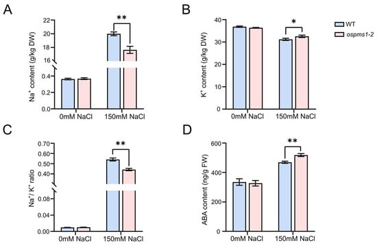 The content of Na+, K+, and ABA in leaves of ospms1-2 mutant and WT rice seedlings at 0 and 3 days under salt stress. (A) Na+ content. (B) K+ content. (C) Na+/K+ ratio. (D) ABA content. Each column represents the mean ± SD (three replicates). Significant differences, which were determined by Students’ t test, were indicated by asterisks (* p < 0.05 and ** p < 0.01).